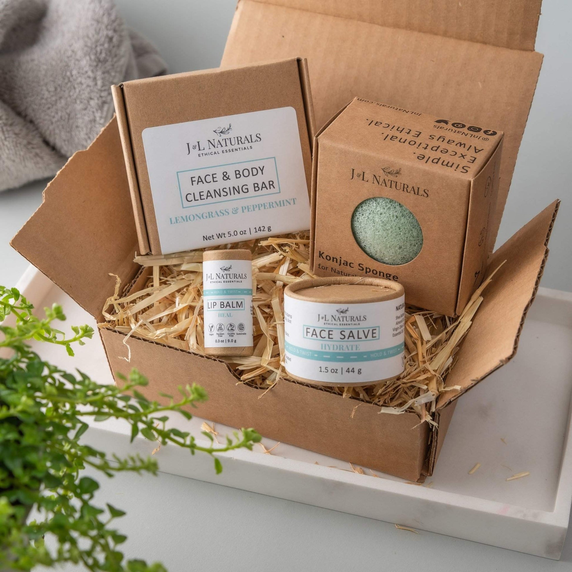 Includes: (1) Cleansing Bar, (1) Konjac Sponge, (1) Face Salve, (1) Lip Balm